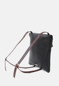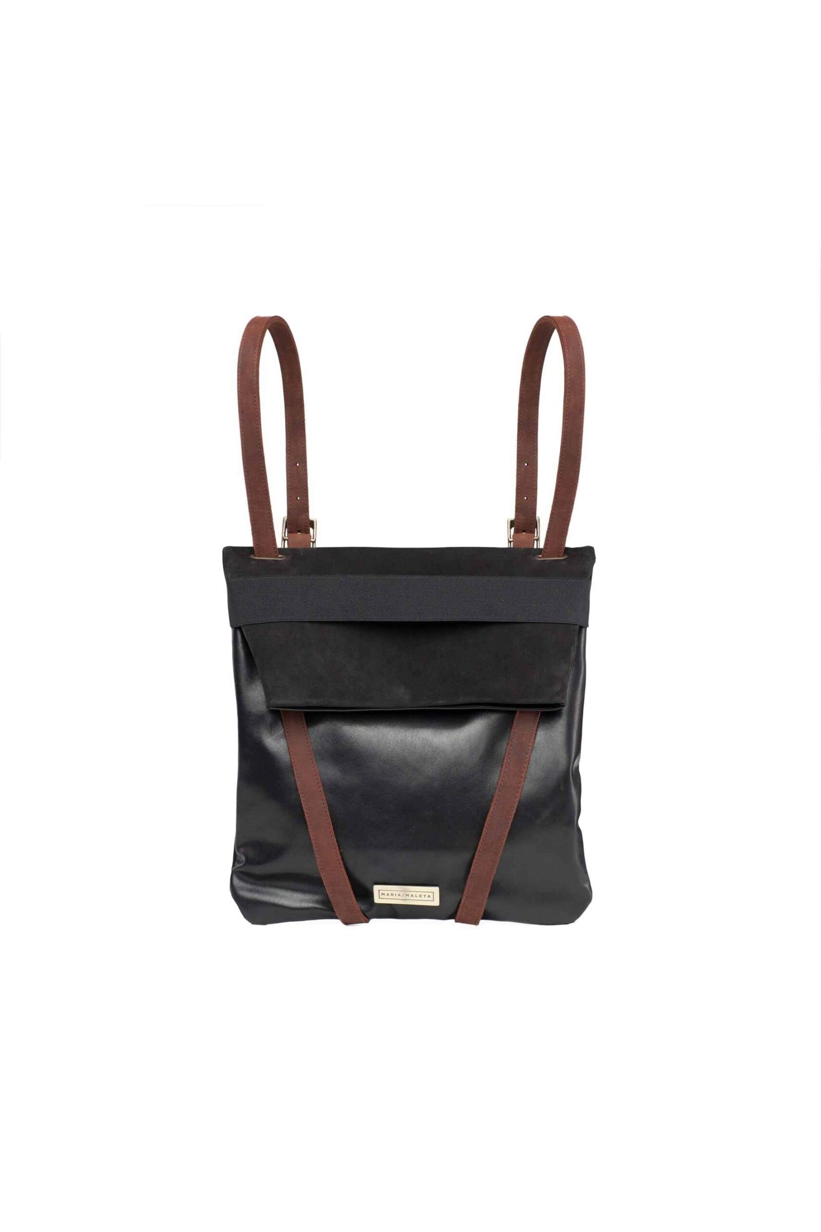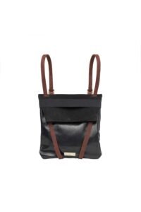 Backpack laptop bag in black leather. Black leather in one side. Back in black nubuck. Upcycled black elastic from the waste of polyester and cotton. and adjustable straps 70cm – 80cm. Two inner pockets. Dimensions: 35×33 cm. With an extra handle strap. REF. MMBPB Made in Portugal